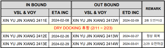 2024년 중국 춘절을 맞이함에 따라 당사 운영 모선 M/V XIN YU JIN XIANG의 DRY DOCKING 및 중국 춘절 연휴 기간 일정에 대해 아래와 같이 공지해 드리니, 참고하시기 바랍니다. - 운영 일정 - ![]() |